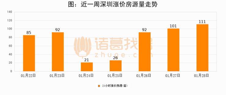 根据诸葛找房数据显示,深圳24小时涨价房源量为111套,较01月27日增加10套,环比上涨9.9%。与此同时,涨价房源占比小幅扩大,业主信心有所提升。