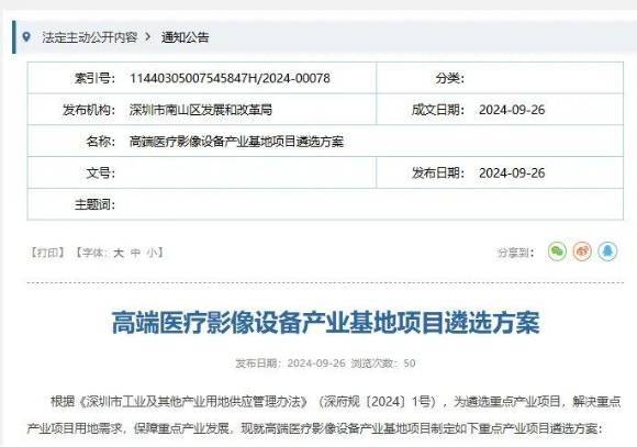 9月,深圳市南山区发展和改革局发布《高端医疗影像设备产业基地项目遴选方案》的公告。项目用地意向区位为[西丽中心区地区]法定图则01-04地块,意向用地单位为西门子(深圳)磁共振有限公司。