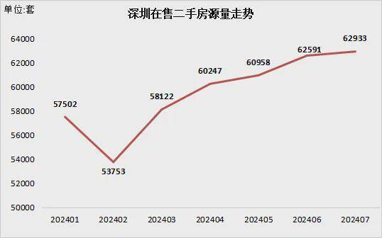 截至2024年8月1日,据深圳市房地产信息平台公开在售二手房数量统计,全市有效在售二手房源62,933套,对比7月1日统计的62,591套在售房源增加342套(如下图),环比小幅增长0.5%。从月内走势看,7月上旬在售量呈现持续增长态势,但在月中后,新增在售量有所疲软,下旬出现小幅回落。整体看,当时市场二手房在售量基本维持在6.3万套左右波动运行。