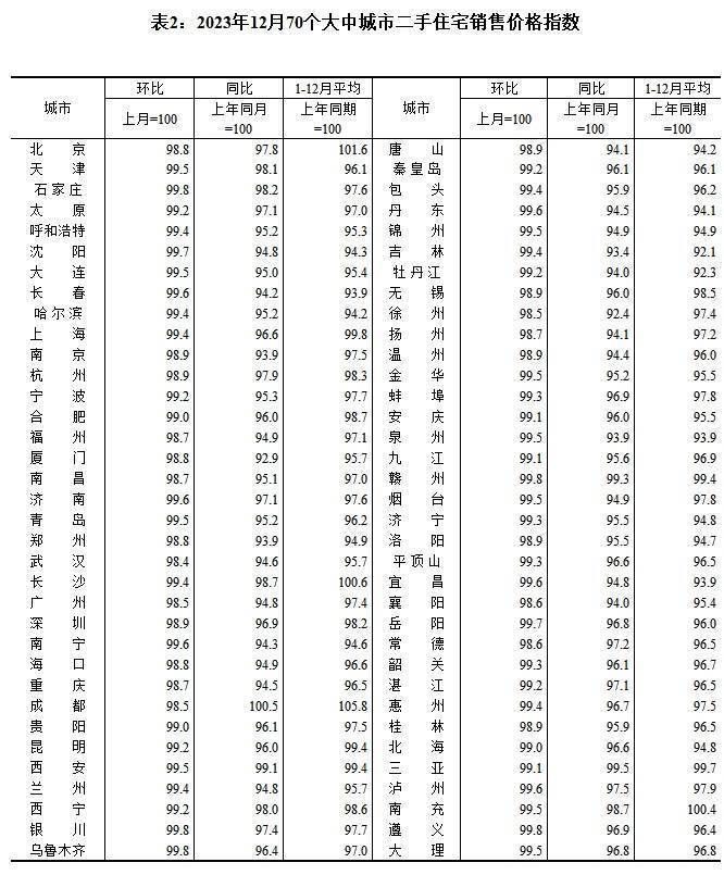 从二手房情况来看,2023年12月,70个城市二手住宅价格环比全部下跌,无一城环比上涨或持平。