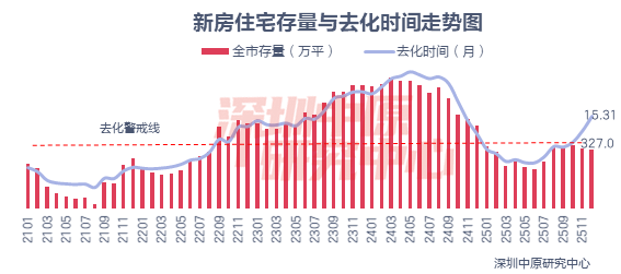 从去化时间来看,按照过去一年的平均成交量来计算,去化时间约为15.31个月,较去年增加了3.03个月,2025年下半年新房去化时间持续增加。