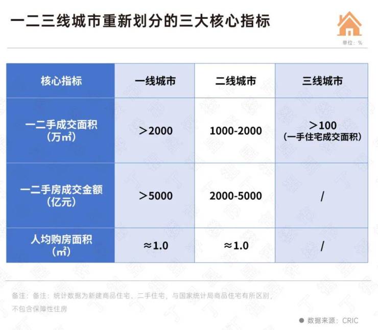 一线城市标准设定为:一二手成交面积高于2000万平方米,成交总金额大于5000亿元,人均购房面积约1.0平方米。