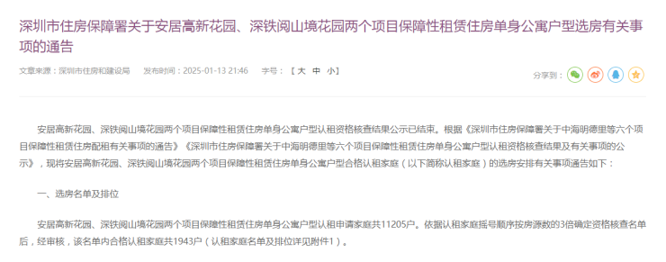 1月13日深圳住建局公示南山安居高新花园、深铁阅山境花园两个项目保障性租赁住房单身公寓户型选房有关事项的通告,公告称,按房源数的3倍确定资格核查名单后,名单内合格认租家庭共1943户。选房时间为2025年1月15日至2025年1月17日,房源选完即止。