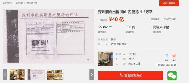 但最新动态显示,2025年3月,凯宾斯基酒店再次以40亿元总价上架酒店交易平台。