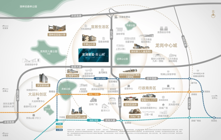 周边仁恒梦中心、星河COCO Park等五大商圈环伺;3km内还有红立方三馆一城(公共艺术馆、青少年宫、科技馆、深圳书城龙岗城)、龙城广场、大运中心等高规格文体配套,丰富日常生活。