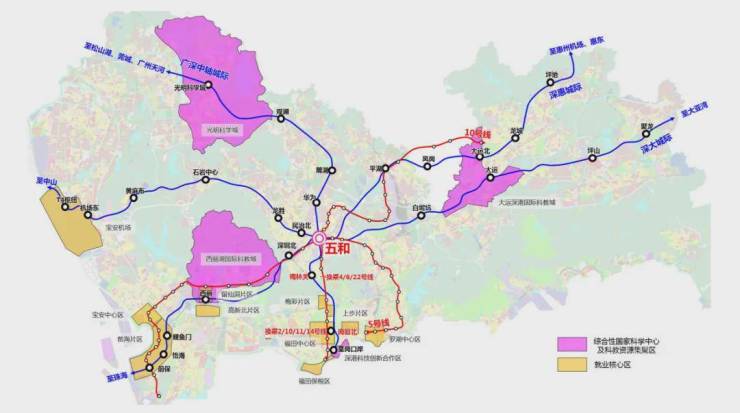 五和枢纽在既有地铁5、10号线基础上,引入在建深大、深惠城际和规划的广深中轴城际,是一座五线换成的城际枢纽。