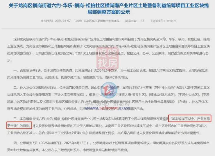4月7日,龙岗区横岗街道六约-华乐-横岗-松柏社区横岗南产业片区土地整备利益统筹项目留用土地土地整备单元规划(草案)公示。