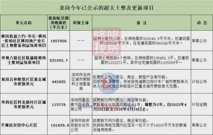 今年目前为止,龙岗已有约5个超大土整及更新项目迎来新的进展(范围10万平以下的未统计),包括2个超大土整利益统筹项目规划(草案)在这两天进行了公示。