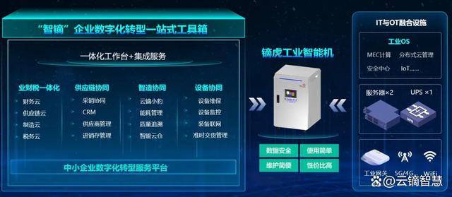 镝虎5G工业智能机作为搭载智镝云工具箱的载体,以软件与硬件融合、5G与边缘云融合、数据与业务融合、管理与运维融合的方式,解决了企业数据需要本地留存、IT硬件运维成本过高,设备数据难采集与数据安全管控的难题,一站式地帮助企业进行数字化选型与融合,高性价比地达到数字化二/三级水平。