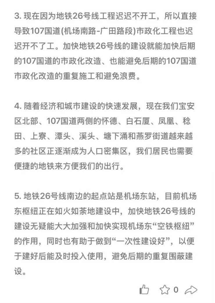 该市民还提到,随着经济和城市建设的快速发展,宝安区北部、107国道两侧的怀德、白石厦、凤凰、稔田、上寮、潭头、溪头、塘下涌和燕罗街道越来越多的社区正逐渐成为人口密集区,居民也需要便捷的地铁来方便出行。