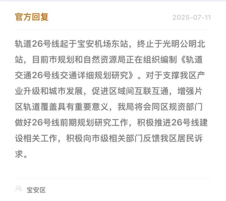 对此,宝安区回复该市民,市规划和自然资源局正在组织编制《轨道交通26号线交通详细规划研究》,将积极推进26号线建设相关工作,一起来关注~