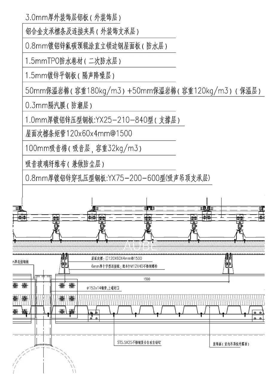 深圳国际会展中心金属屋面防水面积约73.5万平方米,本项目要求为I级防水,因此屋面防水构造层次上,采用了镀铝锌氟碳辊涂直立锁边钢屋面板为外层防水层,1.5mmTPO防水卷材为二次防水层的做法。