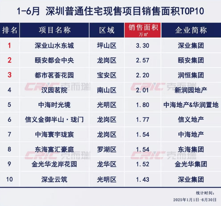 据克尔瑞深圳数据,今年上半年深圳现售新盘销售面积TOP10新盘中,龙岗占3席、光明2席、南山、罗湖、宝安、龙华、坪山各占1席。