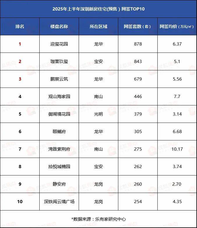 先来看看预售新盘,2025年上半年网签量排名前10的新盘中,迎玺花园共卖出878套居于全市榜首,珈誉玖玺以843套的成交量紧随其后,鹏宸云筑则以679套的网签量位列第三。TOP前3龙华就占了两席,成为最大的赢家。