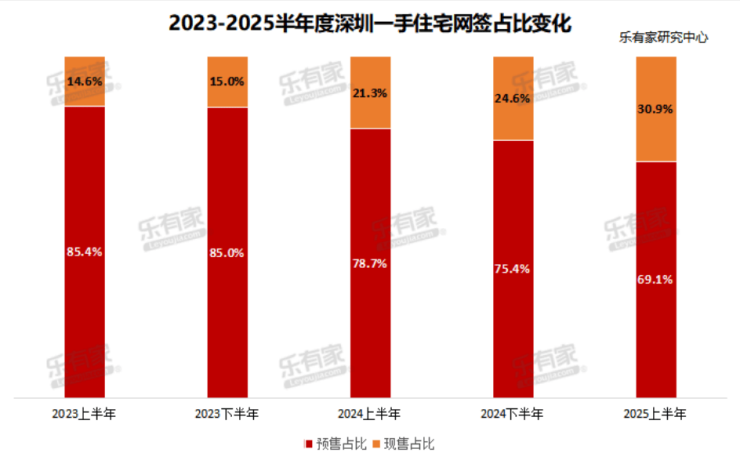 新房成交量中现售住宅的占比逐渐增高,到今年上半年已经占30.9%,而2024年上半年,现售成交占比只有21.3%。
