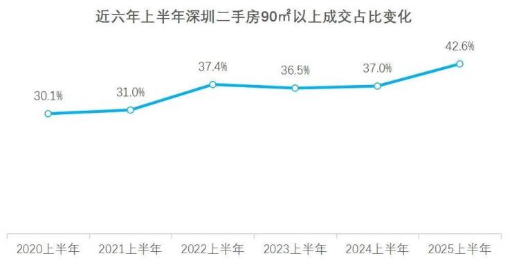 深圳贝壳研究院监测,2025上半年深圳二手房成交中,90㎡以上成交占比为42.6%,是近六年上半年以来首次突破四成。