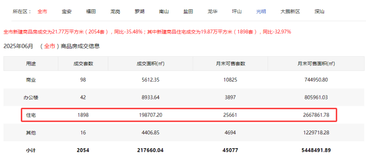 截至6月末,深圳在售(预售)新房住宅25661套,可售面积约2667861.78㎡,按近一年的月成交来算,去化周期约7.5个月。