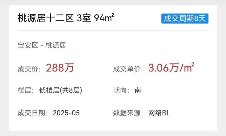 例如,今年5月桃源居十二区,一套94㎡3房,成交总价仅288万,单价3.06万/㎡;