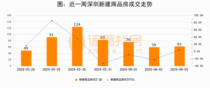 根据深圳市住房和城乡建设局数据显示,2024年06月03日深圳新建商品房成交62套,较昨日增加3套,环比上涨5.1%