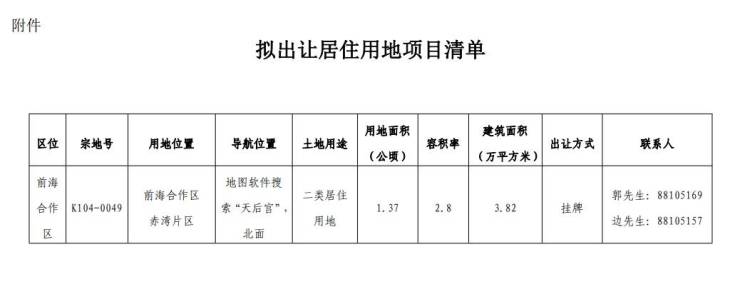 该宗地号K104-0049,用地位置前海合作区赤湾片区,导航位置地图软件搜索“天后宫”北面,土地用途二类居住用地,用地面积1.37公顷,容积率2.8,建筑面积3.82万平方米,出让方式挂牌。