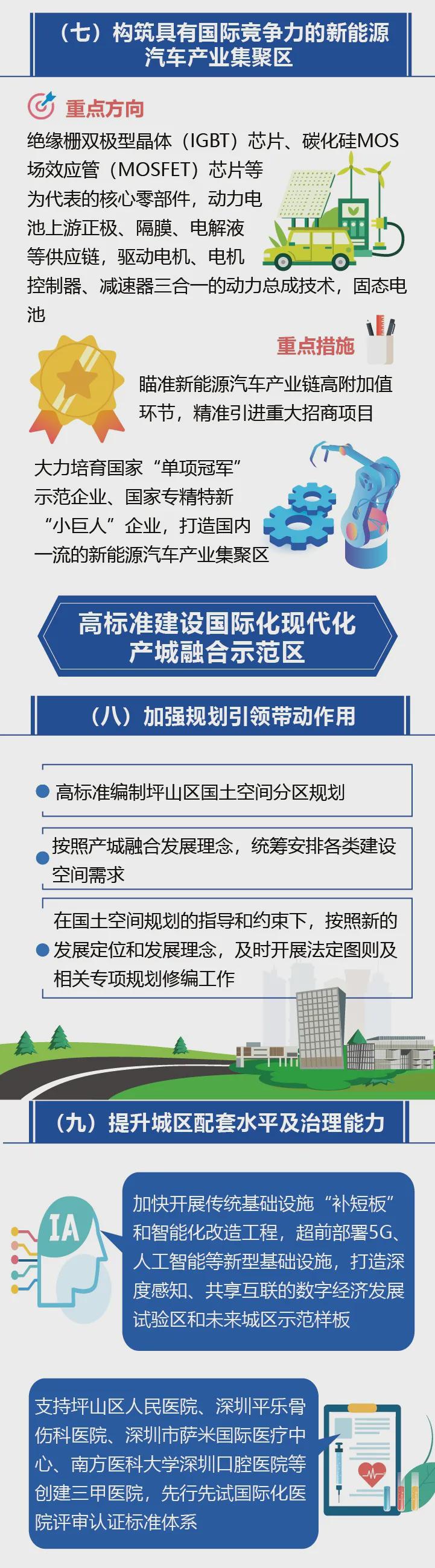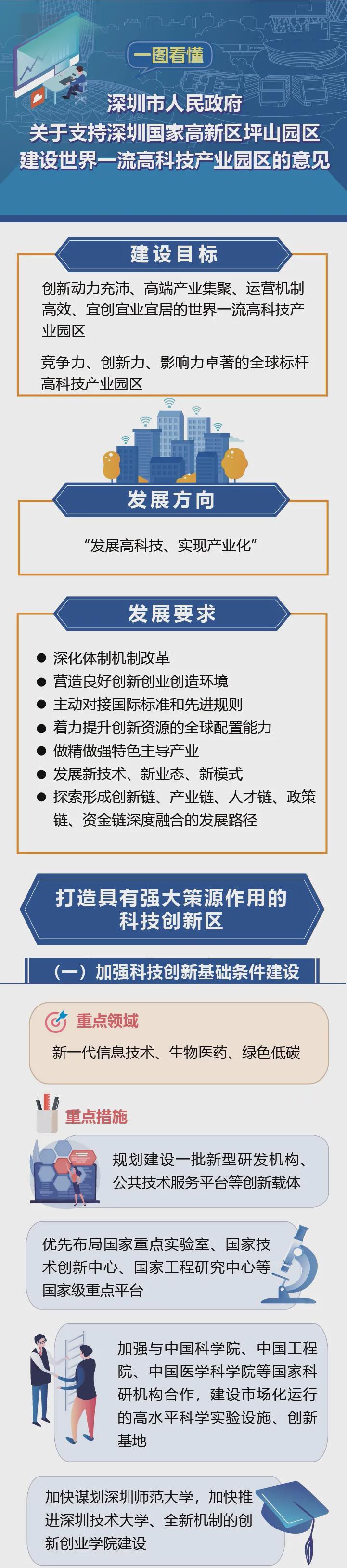 《意见》站位高、政策新、措施实,共六个部分18条重点事项,以“发展高科技、实现产业化”为方向,以深化体制机制改革和营造良好创新创业创造环境为抓手,主动对标、对接国际标准和先进规则,着力提升创新资源的全球配置能力,做精做强特色主导产业,破解深圳高新区高质量发展中面临的产业布局不够合理、管理体制不够健全、配套服务不够完善、产城融合不够紧密等问题,率先探索形成创新链、产业链、人才链、政策链、资金链深度融合的发展路径,努力将坪山高新区建设成竞争力、创新力、影响力先进的全球标杆高科技产业园区。