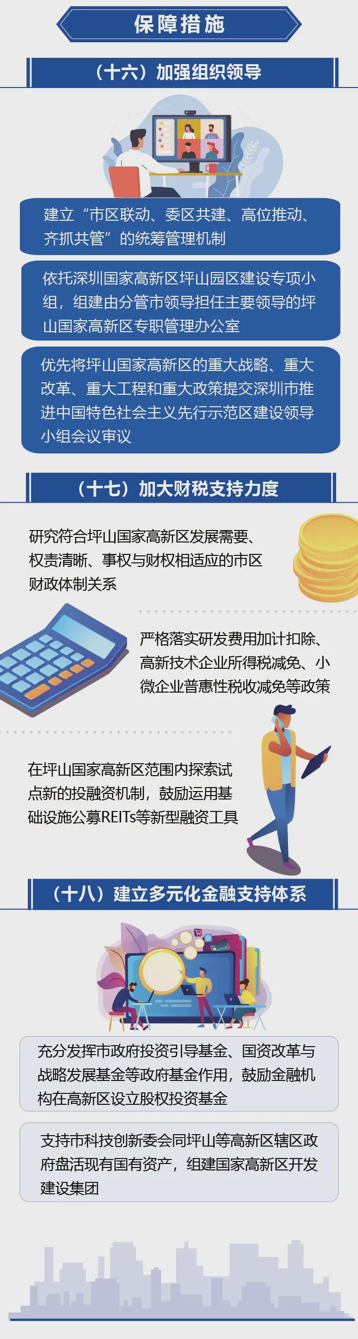 最后,考虑到统筹部署坪山高新区建设是一项系统性工程,需要充分发挥市区共建联动机制,形成攻坚合力,《意见》提出了三项保障措施。一是组建坪山高新区专职管理办公室,支持将坪山高新区的重大战略、重大改革、重大工程和重大政策提交深圳建设先行示范区领导小组会议审议。二是加大财税支持力度,研究符合坪山高新区发展需要的市区财政体制,严格落实相关税收减免政策。三是建立多元化金融支持体系,通过盘活国有资产、组建高新区开发建设集团、鼓励设立股权投资基金、打造综合性的金融支持平台等方式,来充分激发高新区市场活力。