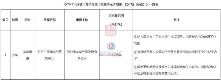 第二批更新计划草案为龙华街道的和平工业园城市更新单元,拟拆除范围为18258平方米。