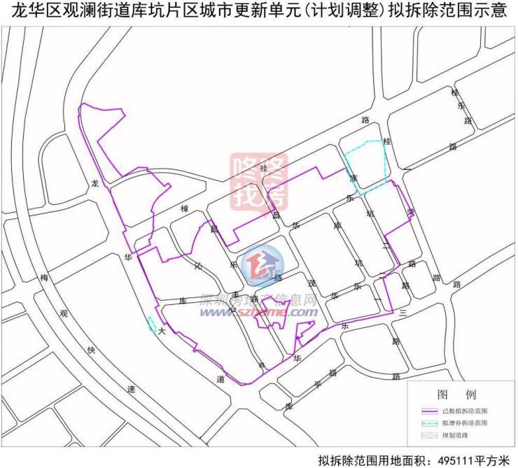 位于观澜街道的库坑片区城市更新单元(计划调整),此项目的拟拆除范围为495111平方米,拟更新方向为工业(含普通工业、新型产业)、居住、商业等功能。