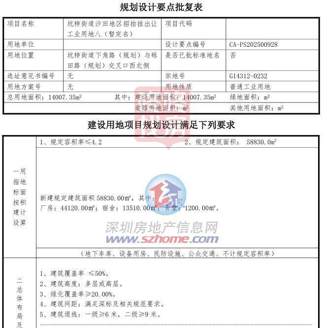宗地号G14312-0232,土地位置坪山区坑梓街道,土地用途普通工业用地,准入行业类别新一代信息技术产业,土地面积14007.35平方米,建筑面积58830平方米,挂牌起始价1690万元,土地使用年限30年。