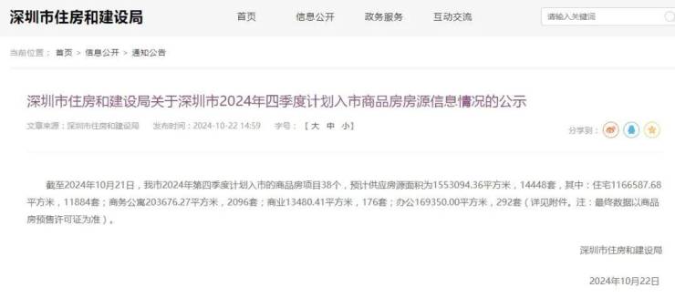 深圳市住建局官宣2024年第四季度计划预售商品房情况。