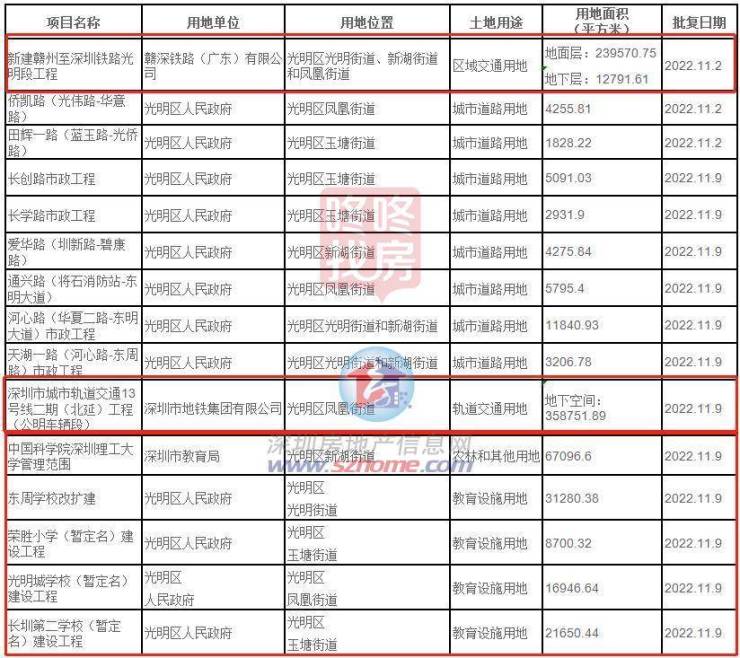 11月18日,深圳市规划和自然资源局光明管理局通告了一批建设项目用地批复。