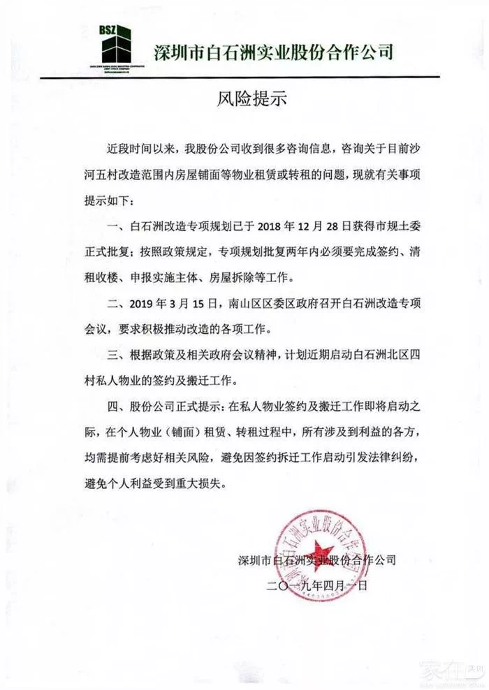 而从“深圳市白石洲实业股份合作公司风险提示”公告可以看到,目前,启动私人物业的签约及搬迁工作的只有白石洲北区四村。