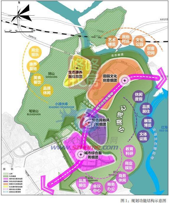 “四组团”是指充分对接南部比亚迪智能制造组团及小漠港区,依托山水 资源和保留村落,形成城市综合服务、特色民俗风貌、田园文化创意、生态康养 居住四大功能组团。