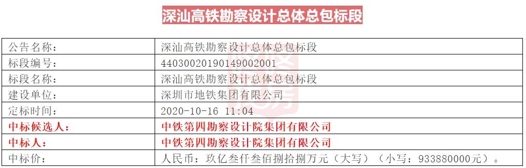 10月16日,线路勘察设计总体总包中标公示,中标人为中铁第四勘察设计院集团有限公司。中标价为9.339亿。