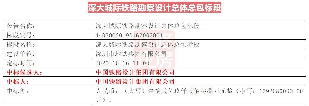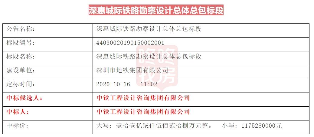 10月16日,深惠城际铁路勘察设计总体总包中标公示,中标人中铁工程设计咨询集团有限公司。中标价为11.75亿。