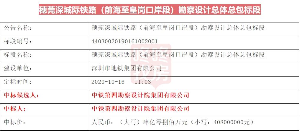 10月16日,线路勘察设计总体总包中标公示,中标人为中铁第四勘察设计院集团有限公司。中标价为4.08亿。