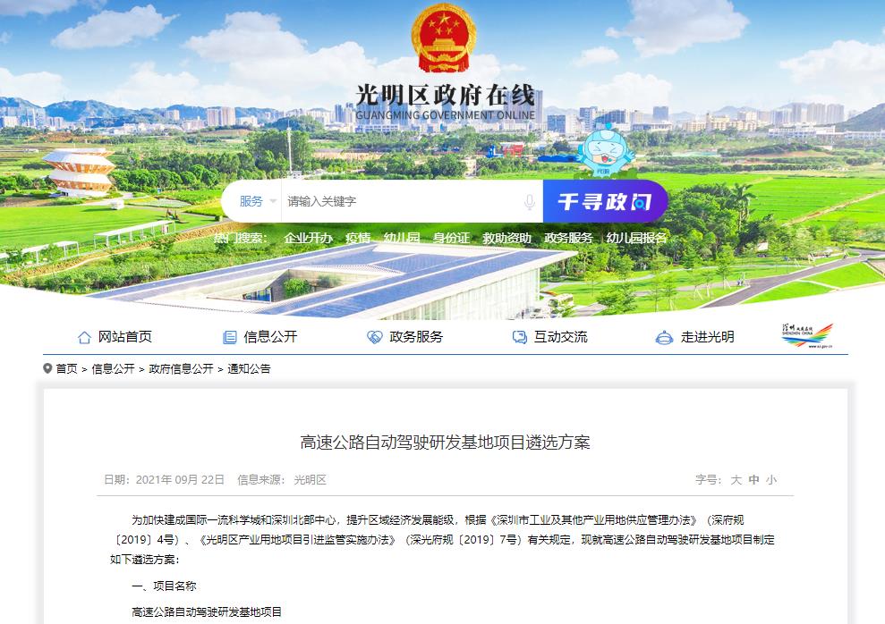 9月23日,光明政府发布高速公路自动驾驶研发基地项目遴选方案。