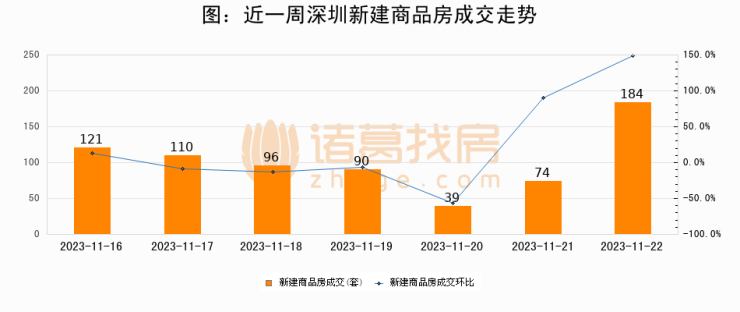 根据深圳市住房和城乡建设局数据显示,2023年11月22日深圳新建商品房成交184套,较昨日增加110套,环比上涨148.7%
