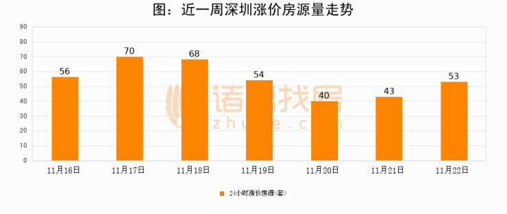 根据诸葛找房数据显示,深圳24小时涨价房源量为53套,较11月21日增加10套,环比上涨23.3%。与此同时,涨价房源占比小幅扩大,业主信心有所提升。