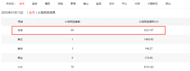 2025年1月13日新房住宅认购网签60套。其中,宝安19套;福田2套;龙岗13套;罗湖1套;南山1套;盐田0套;龙华10套;坪山1套;光明13套;大鹏0套;深汕0套。