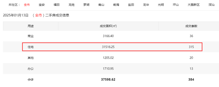 2025年1月13日二手房住宅网签315套。其中,宝安52套;福田53套;龙岗61套;罗湖50套;南山51套;盐田6套;龙华31套;坪山4套;光明5套;大鹏2套。