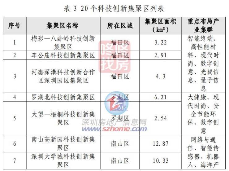 落实国土空间总体规划创新空间格局,统筹深圳国家高新区、深圳国家自主创新示范区、高等教育校区等空间布局,衔接光明科学城、河套深港科技创新合作区深圳园区、西丽湖国际科教城、空港会展海洋新城等重点片区规划,结合详细规划城镇单元划定及产城融合要求,统筹划定科技创新集聚区空间范围,在罗湖、福田、南山、盐田、宝安、龙岗、 龙华、坪山、光明等 9 个区布局 20 个科技创新集聚区,引导战略性新兴产业与未来产业研发环节及各类科技创新资源集中布局,总用地面积约 192 平方公里。