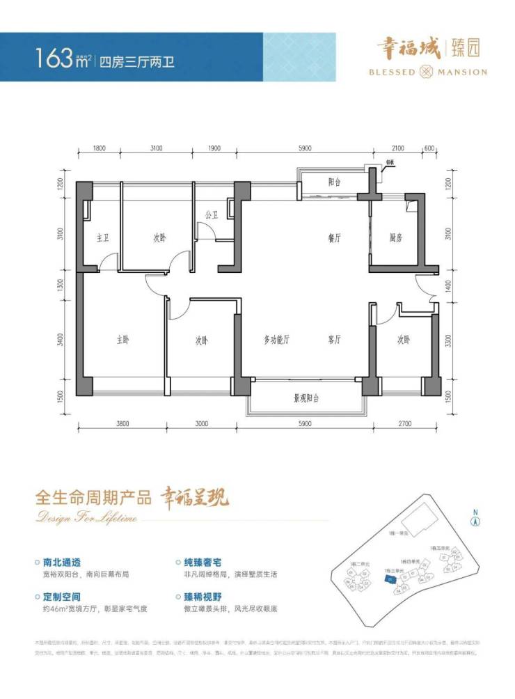 建面约163㎡四房三厅二卫户型,更以空中平墅概念设计,南北双阳台,空气自然流通,配备约46㎡宽境方厅。