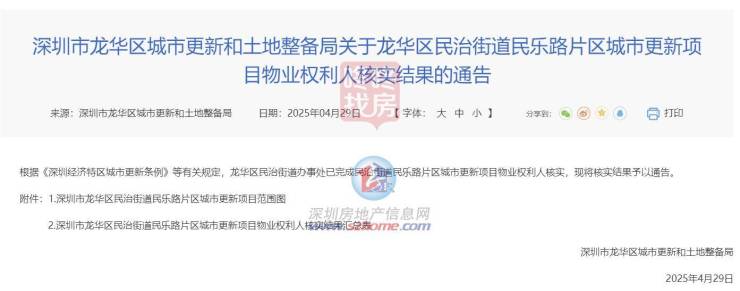 据4月29日消息,龙华区民治街道办事处已完成民治街道民乐路片区城市更新项目物业权利人核实。
