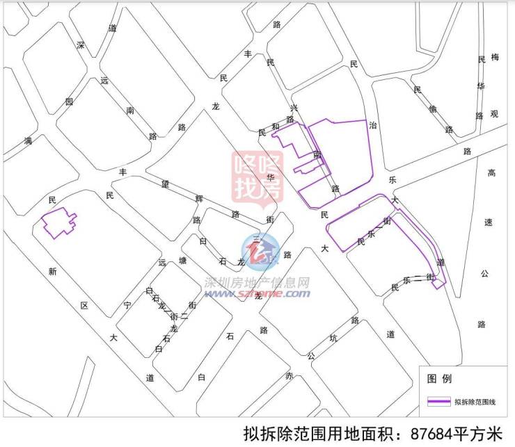 民乐路片区城市更新单元位于龙华民治街道,申报主体深圳市龙华区民治街道办事处、深圳市天珉房地产开发有限公司,拟拆除范围87684平方米。