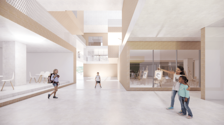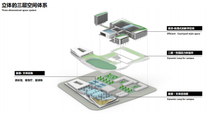 学校创设开放式的立体活动空间,把运动场馆和教学场馆联系在一起,给孩子们一个非常宽阔的活力空间。趣味步道,种植体验区、教师休闲空间、运动空间和露天剧场都能够满足孩子们各种活动的需求,像一只灵动的海鸥翅膀,与国际化高度契合,极具海洋文化气息。