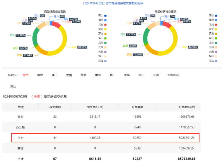2024年9月2日新房住宅共网签44套。宝安18套;福田1套;龙岗4套;罗湖6套;南山0套;盐田1套;龙华8套;坪山2套;光明4套;大鹏0套;深汕0套。