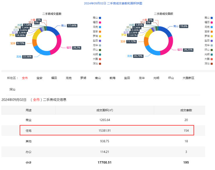 2024年9月2日二手房住宅网签154套。宝安15套;福田36套;龙岗42套;罗湖24套;南山25套;盐田4套;龙华3套;光明3套;坪山2套;大鹏0套。