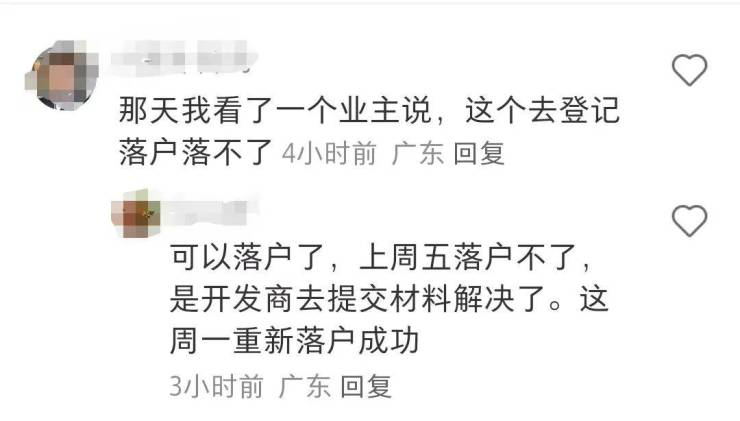 在社交平台上,有业主留言了丹华公馆落户的相关问题,“上周五还落户不了,这周一重新落户成功。”