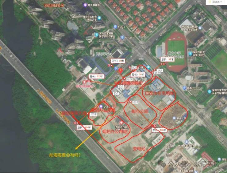 更重要的是,根据片区规划图显示,该项目地段四周基本均是商业办公地块。尤其是阅臻府西南面的商业办公地块,后期不管是建写字楼还是改成住宅地块,都将直接遮挡阅臻府西南面的前海景观视野。这也就是说,阅臻府后期很可能是一个不能看海,景观视野受限,且被周围高密度写字楼包围的一个噪音楼盘。